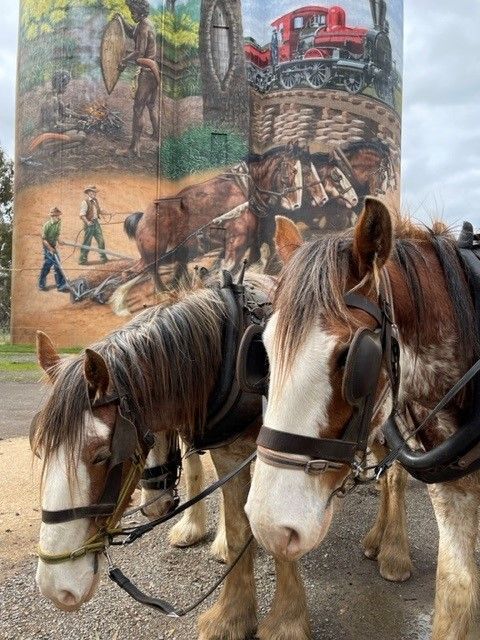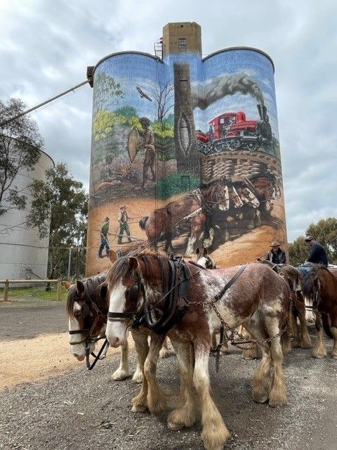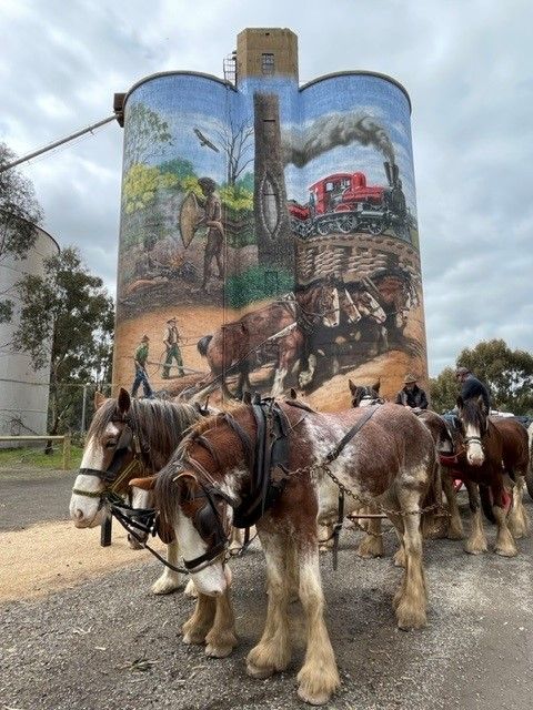 The new silo artwork showcases a Wedge Tailed eagle, symbolizing the connection to the metal eagle in the Lions Park and paying homage to the traditional owners, the Kwat Kwat/Bangerang people. The left silo portrays indigenous figures camped along the Boosey Creek, and a Scar Tree runs down the center, connecting the two silos. The design also features local plants and rare wildflowers. The top right showcases the first passenger train engine that serviced Katamatite in its early settlement days. The bottom of both silos features a depiction of horses pulling a scoop to create irrigation channels, which played a crucial role in opening up the region to farming.