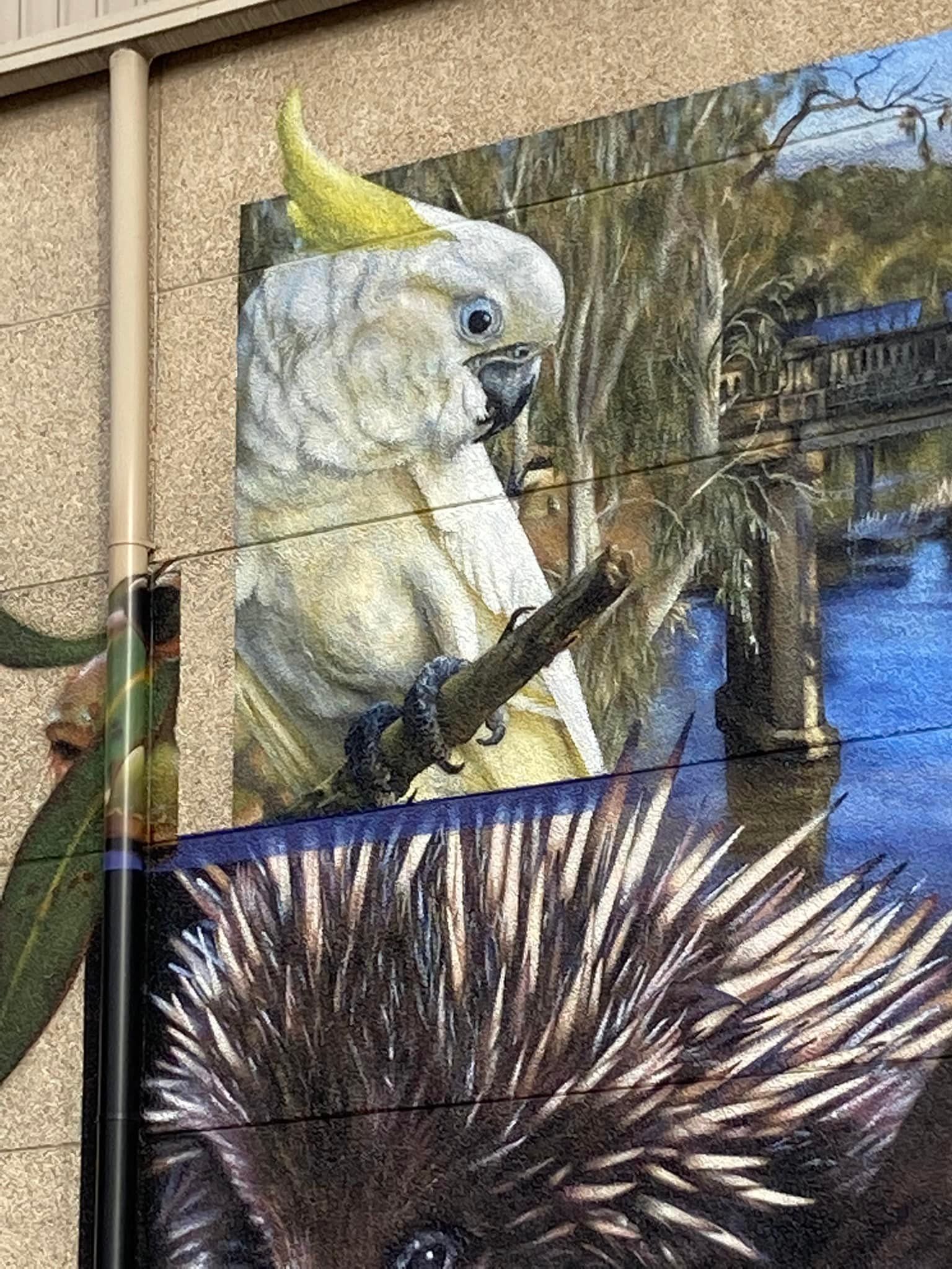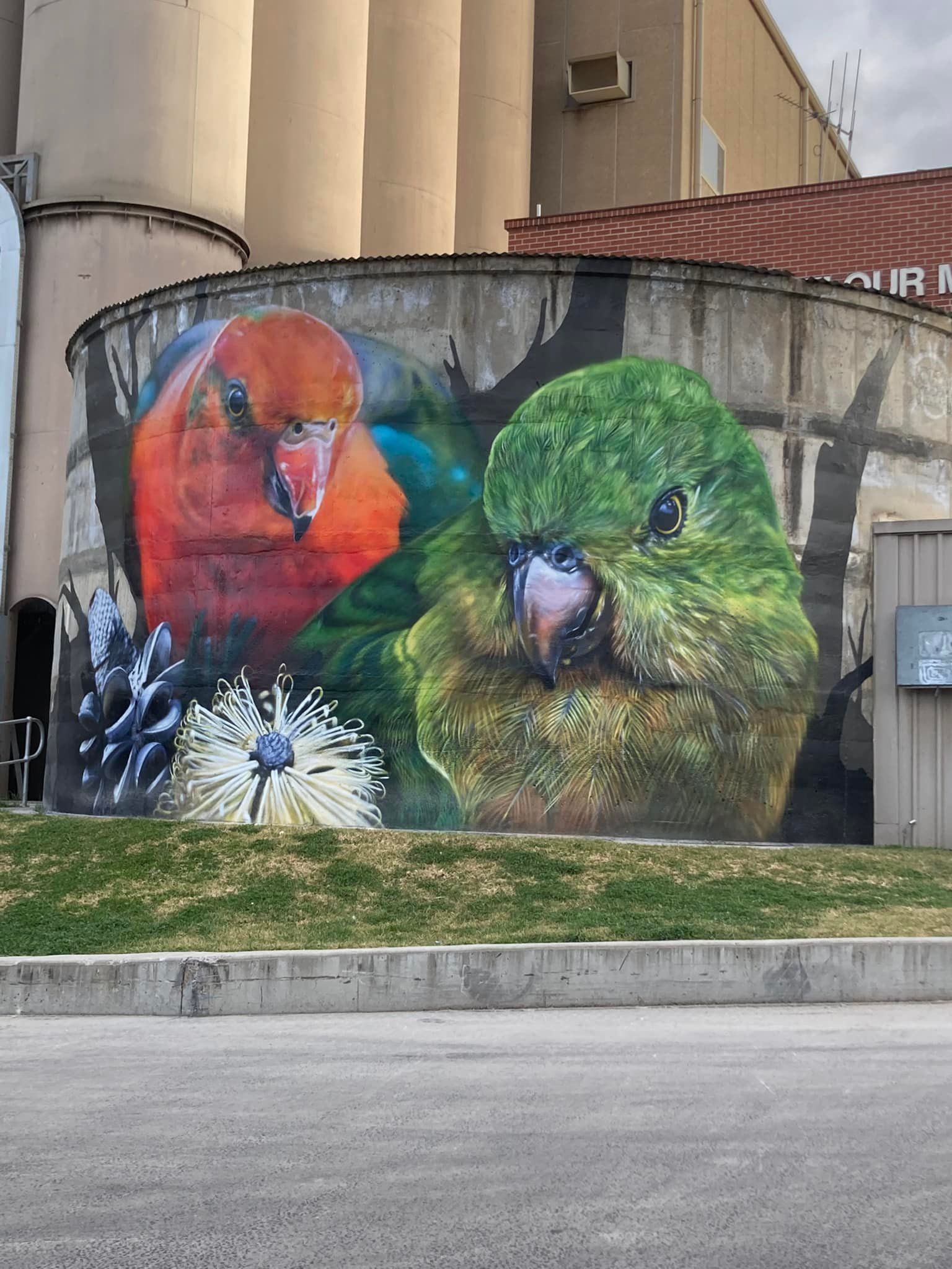 This water tank features Male and Female King Parrots with a banksia flower and seed pod. The Banksia can be found growing near the rest stop down the road and the parrots were nesting in the old red gum next to the Mandagery Creek bridge.