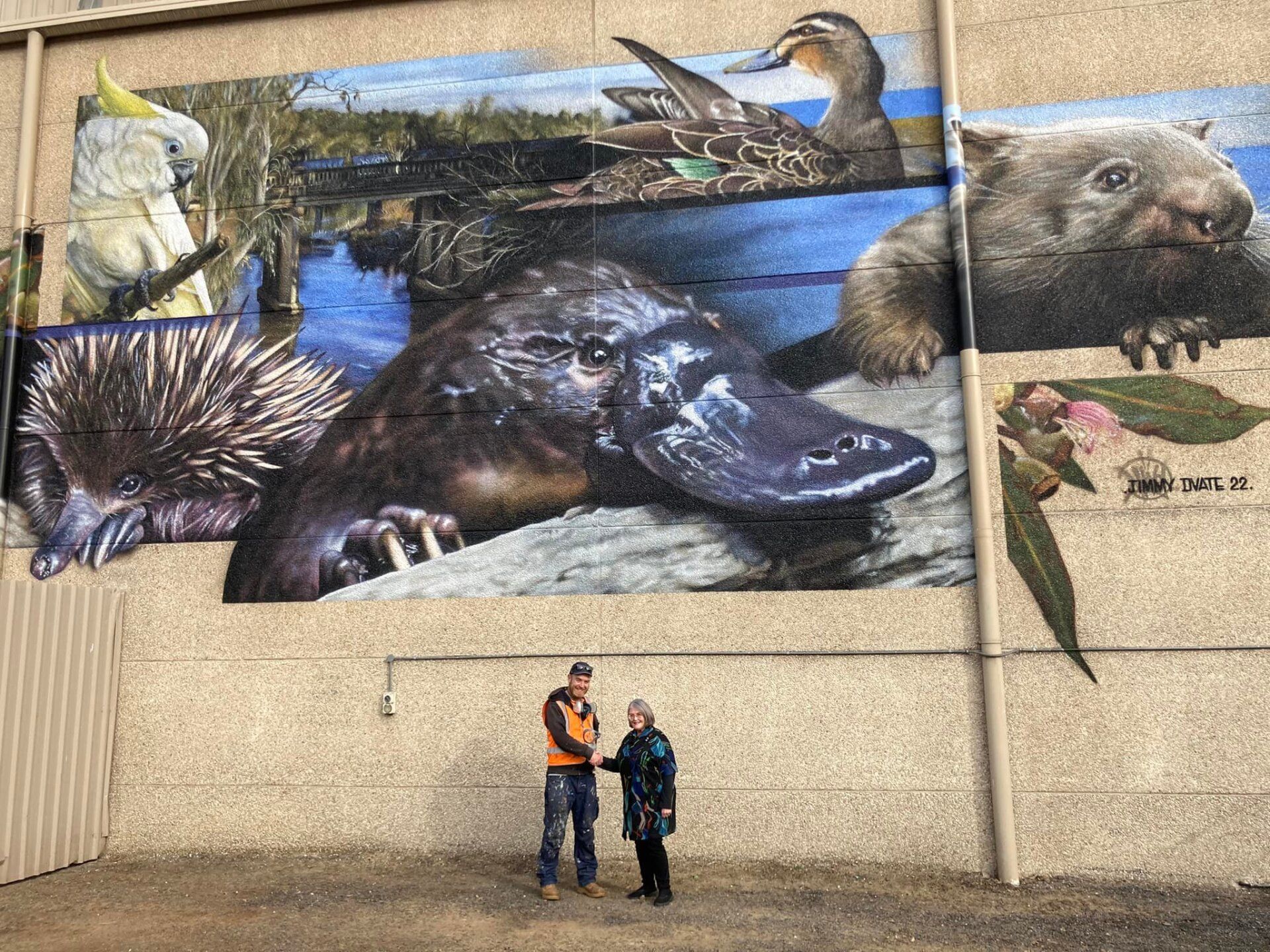 The Manildra (@manildra ) water tank art was painted by Jimmy Dvate and was assisted by Justin in July 2022, along with the water tank and a mural was completed on the adjacent wall on the side of the Manildra flour Mill.