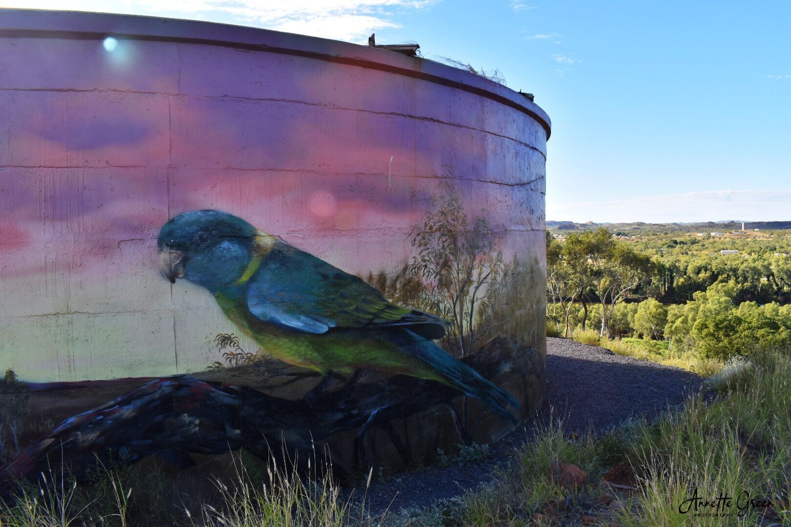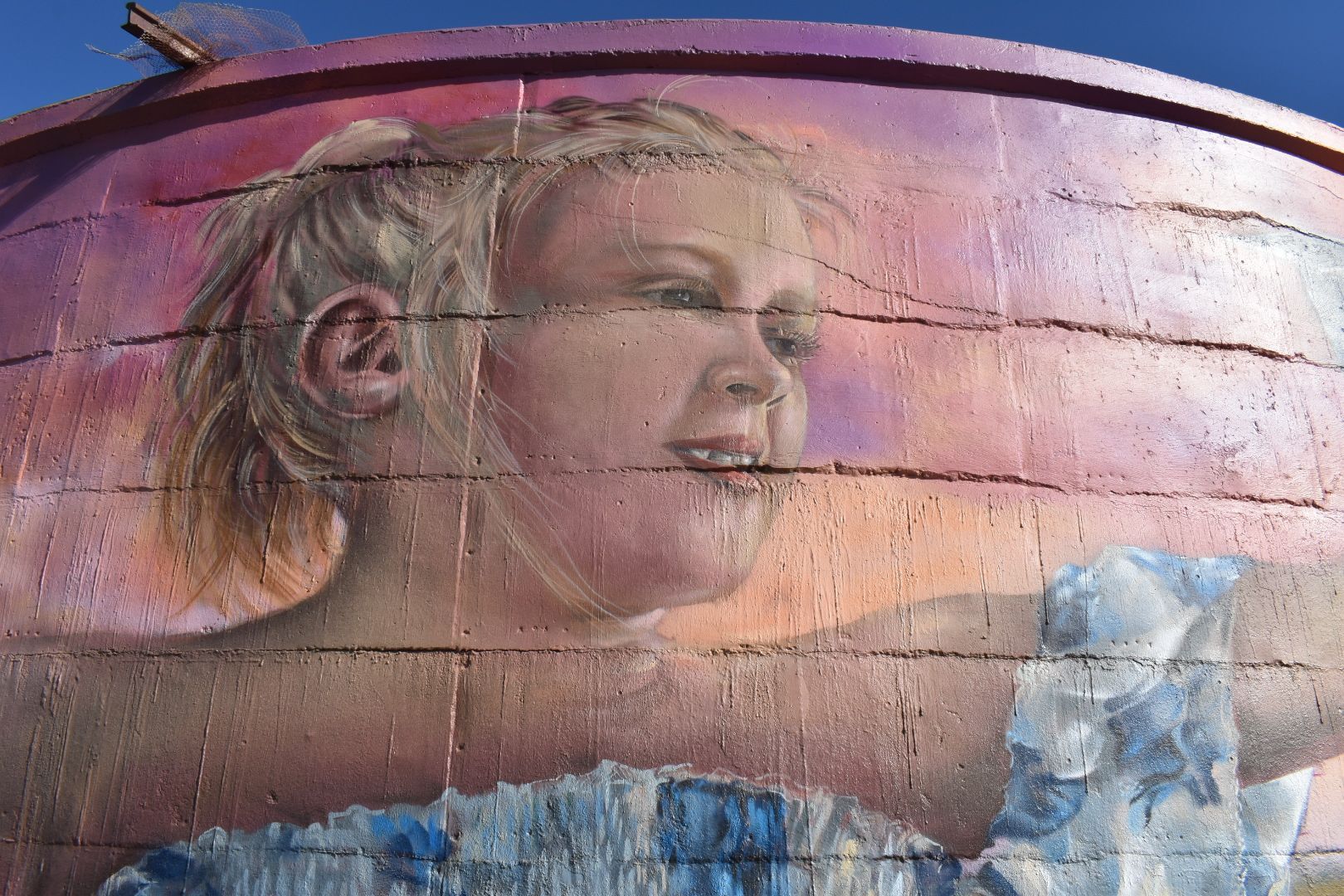 On the opposite side of the tank, the mural features Brianna, also a "Deadly Dancer." She is depicted tossing a paper plane across the landscape, symbolizing Cloncurry as the birthplace of the Royal Flying Doctor Service.