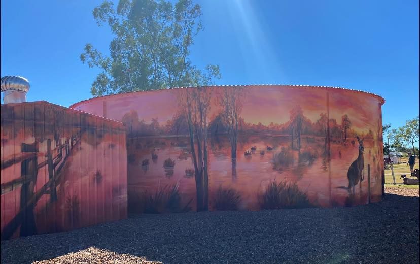 The mural on the tank vividly depicts the devastating floods that struck Cloncurry in early 2019. During this time, relentless rainfall for over 10 days transformed the landscape into an inland sea, causing significant damage to local wildlife and the cattle industry.