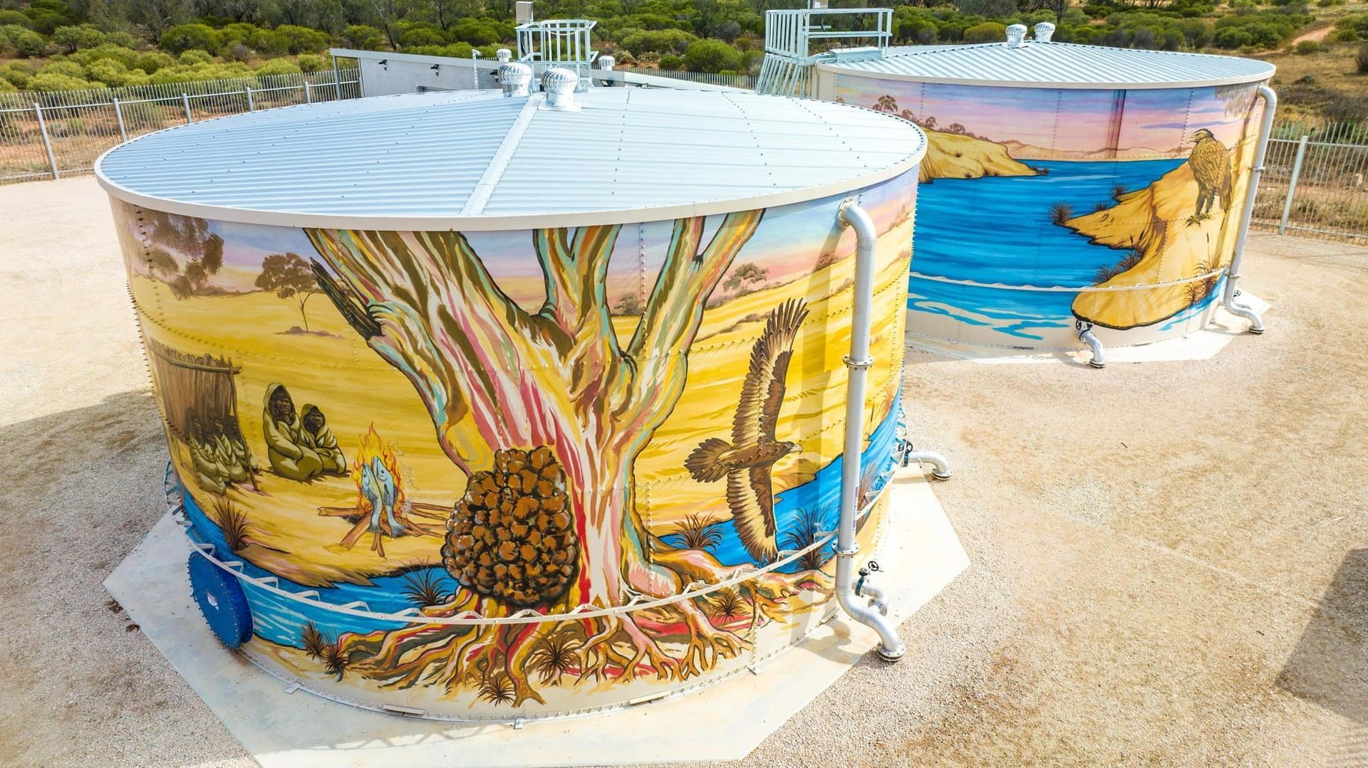 The newly completed water tank art in Coomealla, NSW, has transformed vital infrastructure into a powerful symbol of community and culture. Local Maura/Barkandji artist John Mitchell has added a vibrant cultural and artistic layer to Namatjira’s upgraded raw water supply system, with his design inspiring the striking murals now featured on the two new water tanks.