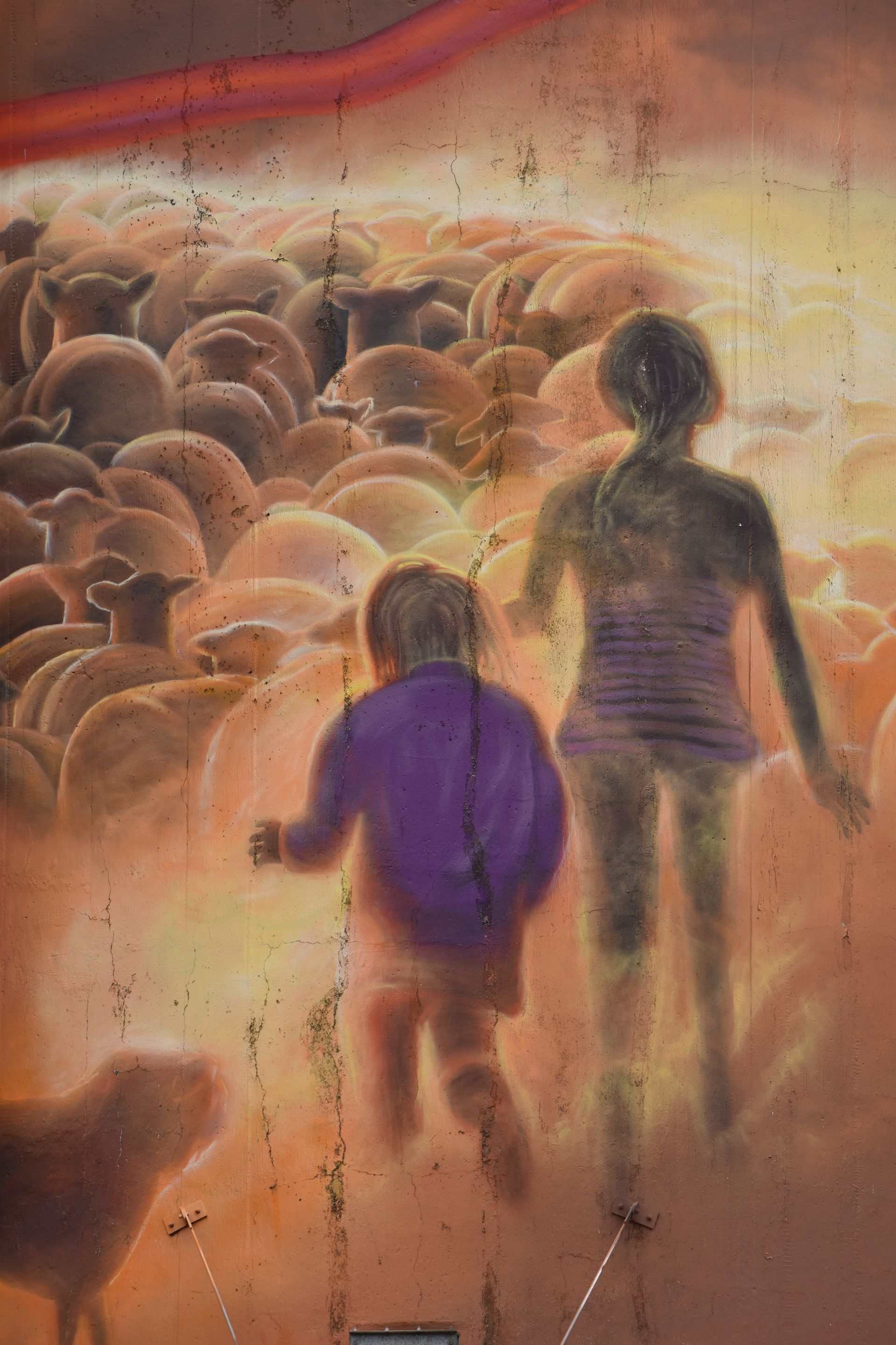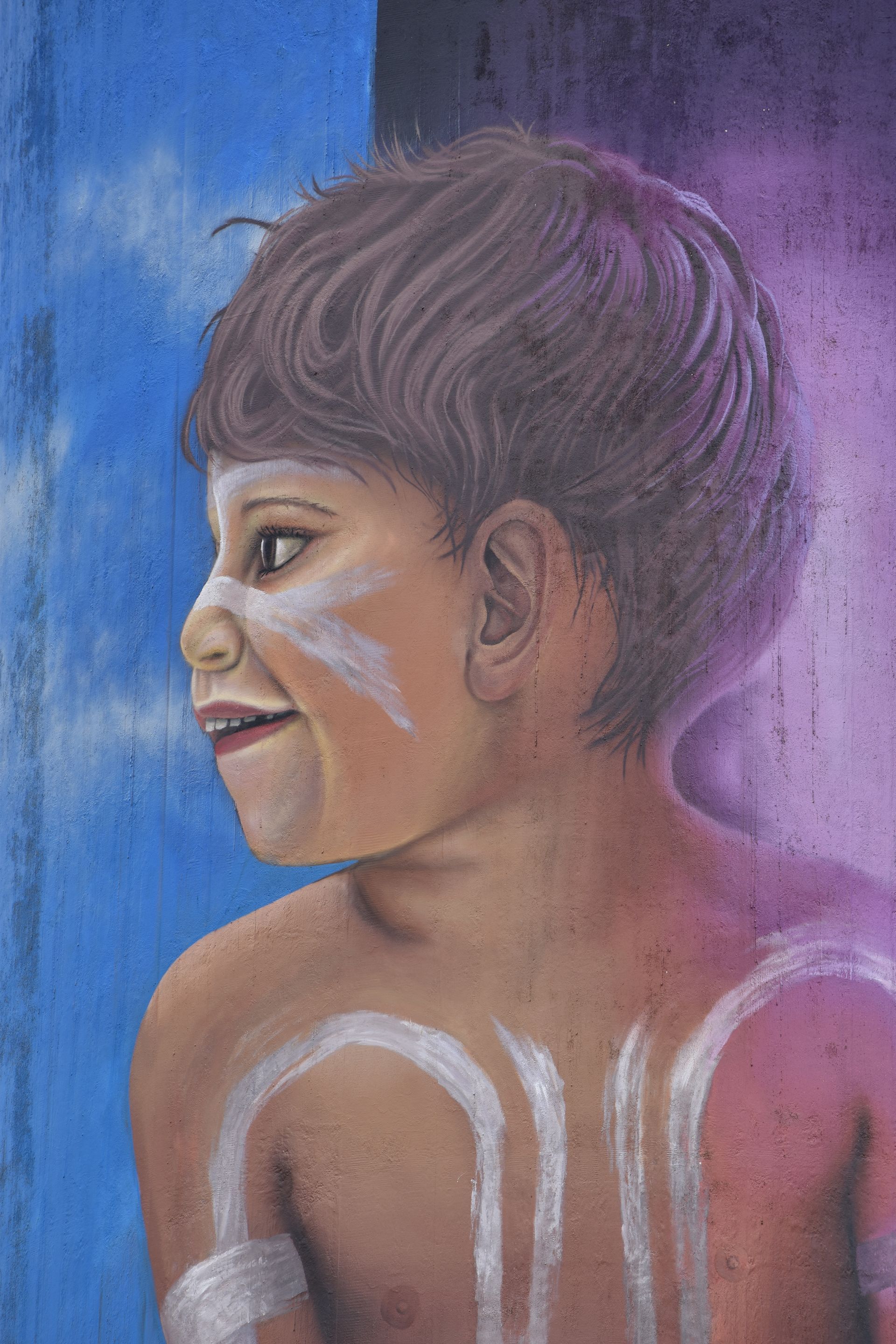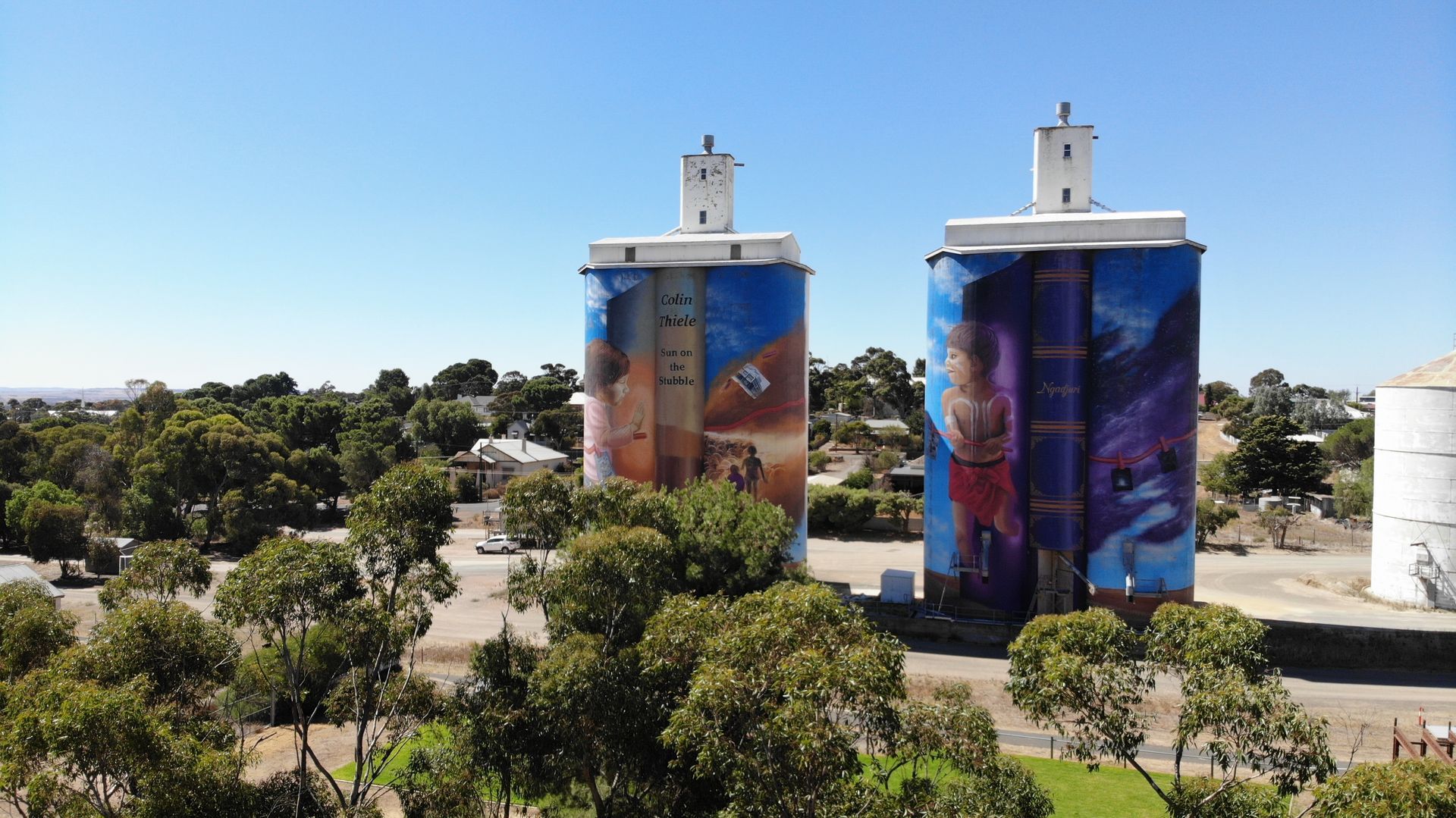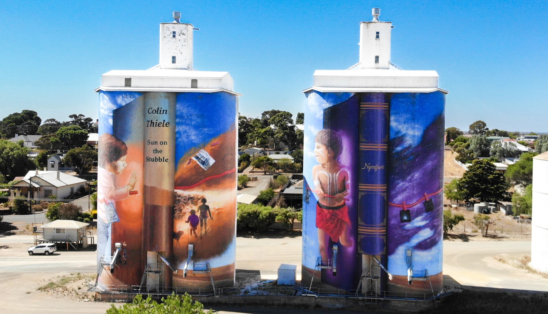 The Ngadjuri child steps through his own history, inviting the child on the other silo to come and learn about his culture. As if to playfully say “hey, come over here and learn about my culture too!” The Ngadjuri storybook, represented by stars and galaxies was a choice made in collaboration with local Elder, and Ngadjuri spokesperson Quentin Aegius. We decided that one single book is never enough to summarise such a HUGE part of history and culture.