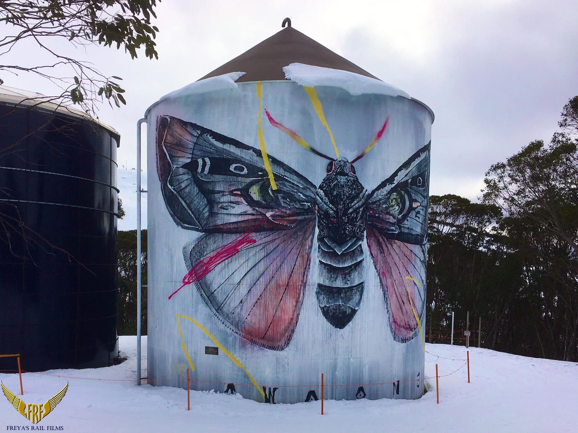 Thanks to the local Artist in Residence Program, this once purely functional structure has been transformed into a breathtaking canvas for street art, captivating all who pass by. Now, visitors can witness the tank in a whole new light, as it proudly showcases an extraordinary mural titled ‘Big Fella’, a visually striking artwork that pays homage to the culturally significant Bogong Moth.
