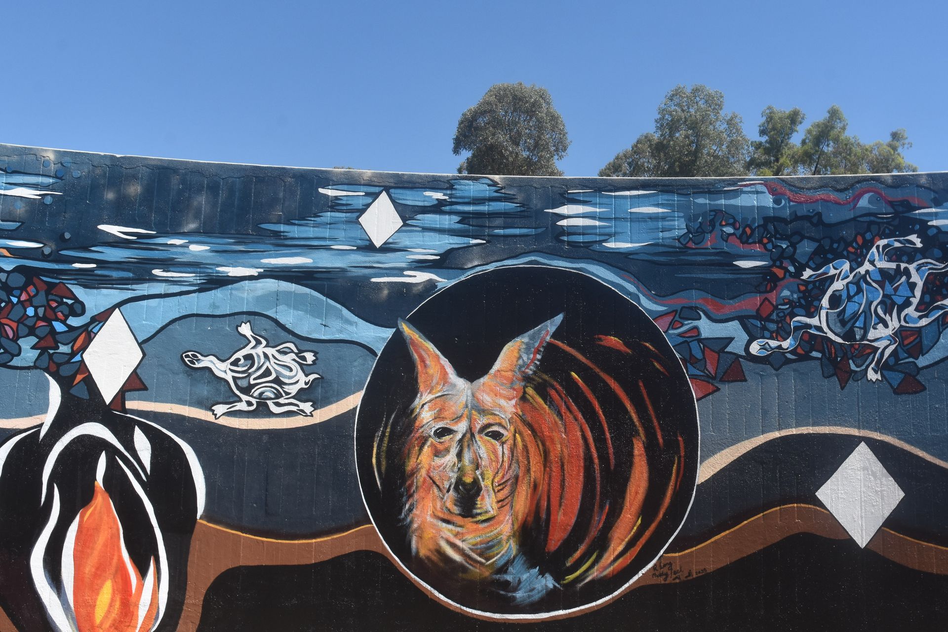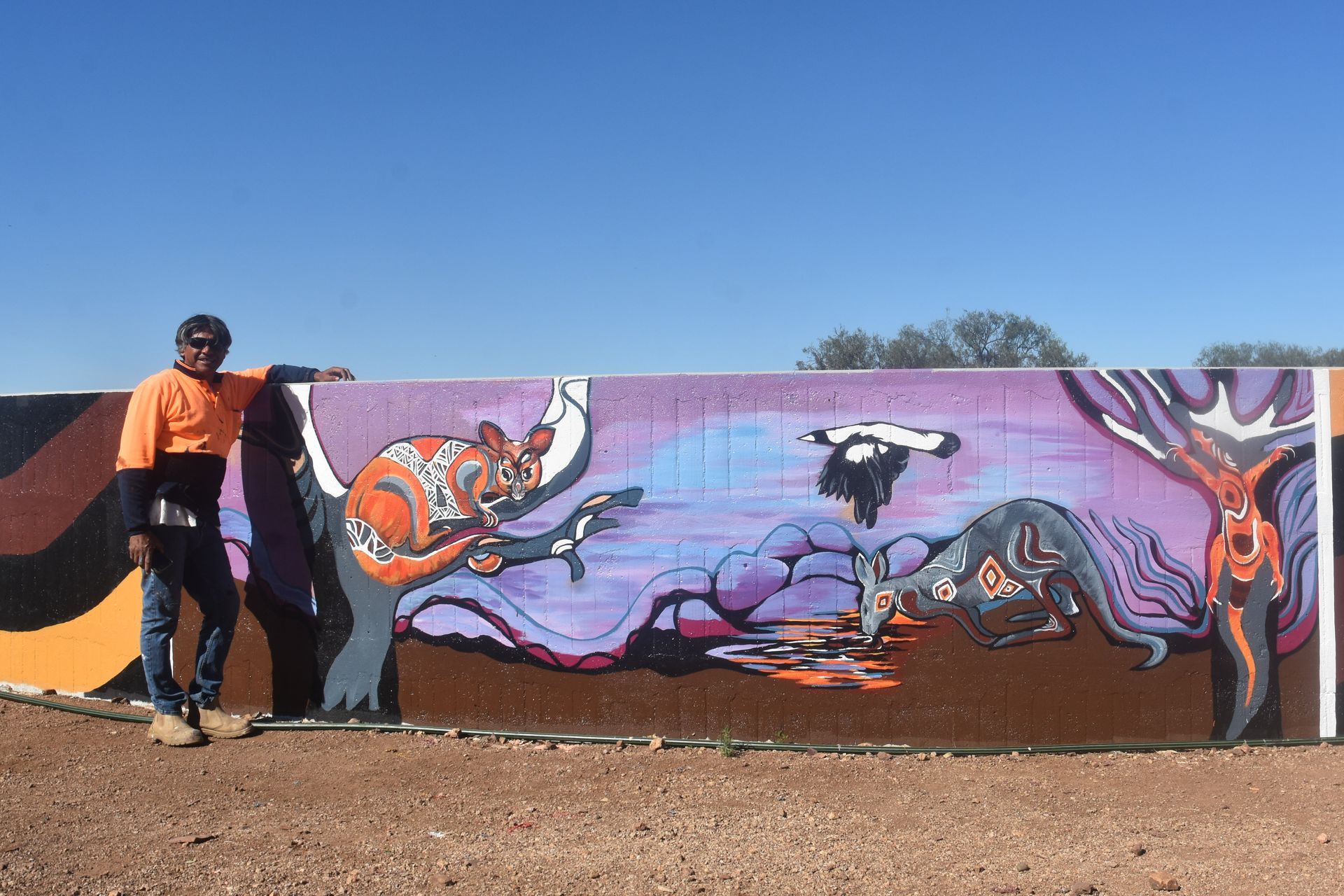 Best known locally for the Dorothea Mackellar silo artwork, Heesco has now painted half of the tank inside and out, drawing inspiration from the site’s history and the families who once lived there. On the other half, artist Ronnie Long created imagery of local animals and totems, reflecting the Aboriginal cultural perspective of the area.