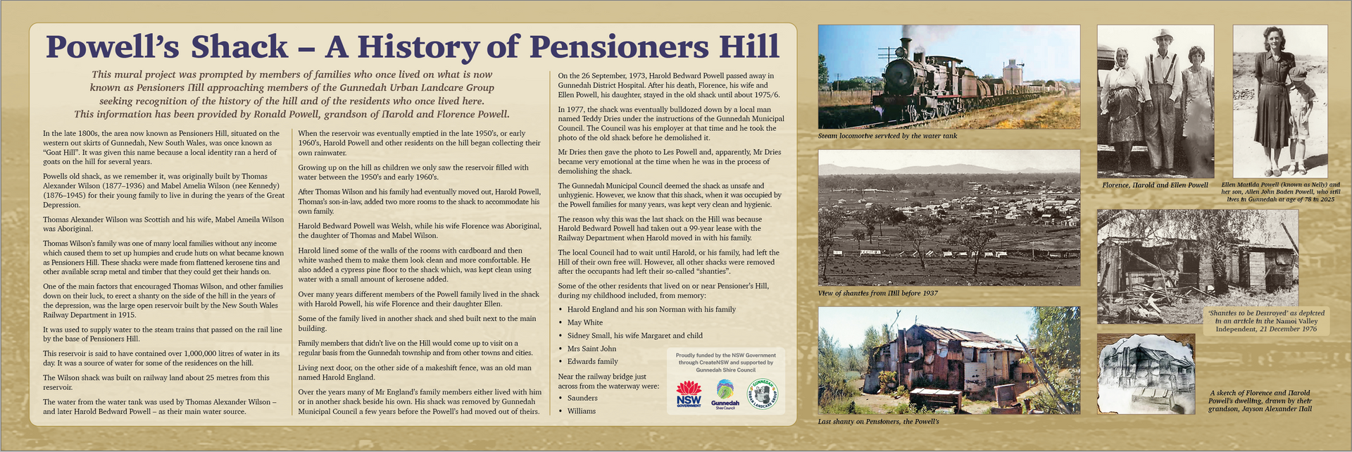 Pensioners Hill, on the western outskirts of Gunnedah, was once known as “Goat Hill,” named after a local herd of goats. During the Great Depression, families facing hardship built makeshift homes on the hill using scrap materials. Among them was Thomas Alexander Wilson and his wife Mabel, who established a small shack near a large railway reservoir built in 1915 to supply steam trains.