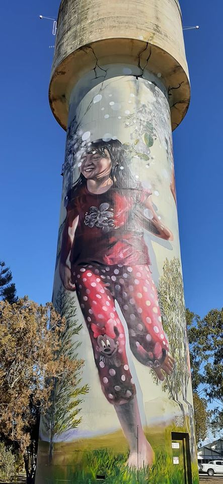 The artwork adorns all sides of the tower, depicting three teenagers playing beneath the water tank, seemingly drenched by water