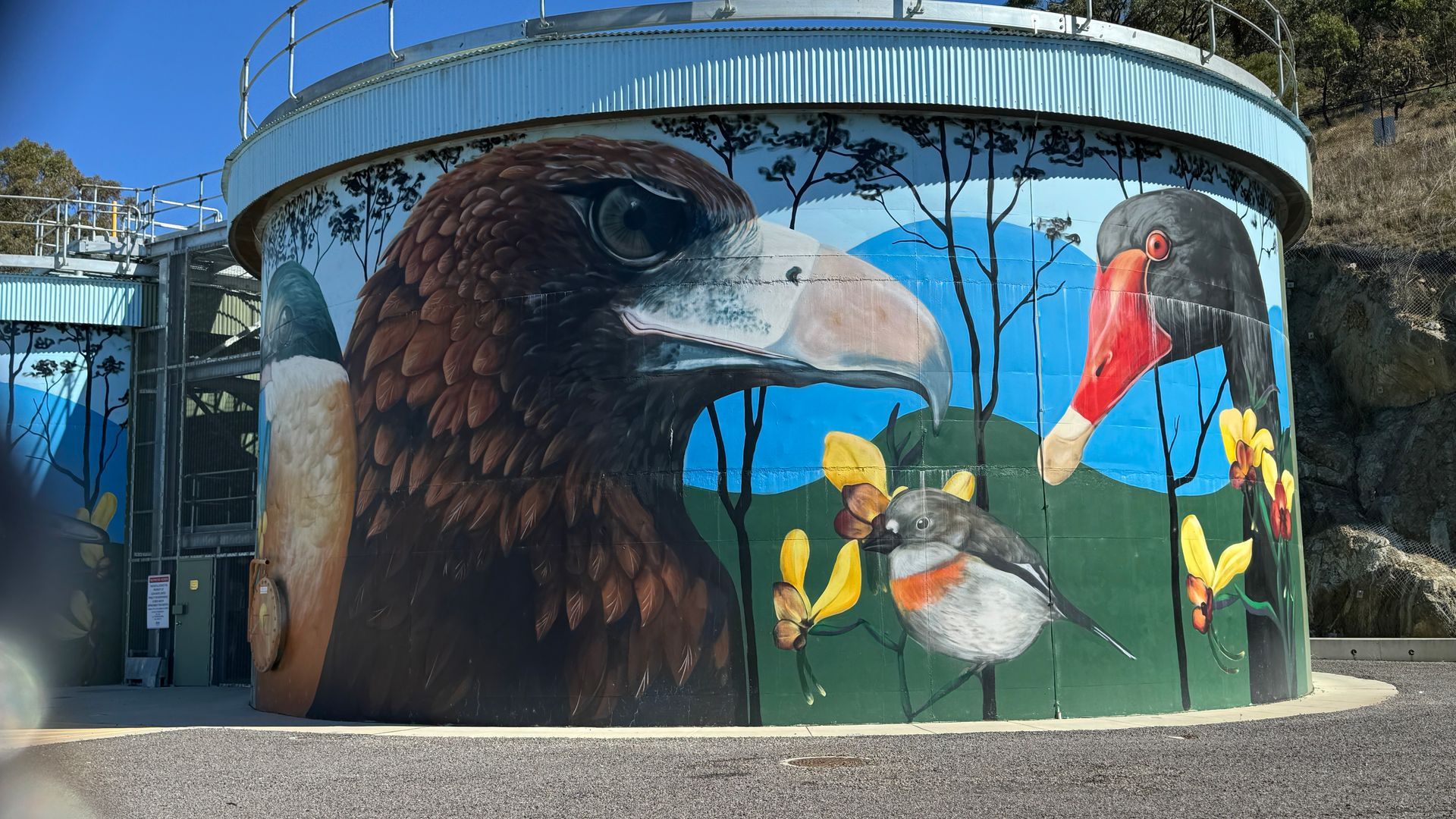 The overall design of the mural was created with the view from a distance in mind, as the water tanks are positioned high on a hill overlooking the suburb. The artist wanted to ensure that the mural was not only visually striking up close but also readable and captivating from afar. To achieve this, the animals and birds were painted at a larger scale, making them stand out and creating a lasting impression for anyone who sees the mural from a distance.