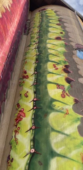 The exterior of the silo features a large-scale mural on the northern face of the silo, whilst the interior features internal artworks.