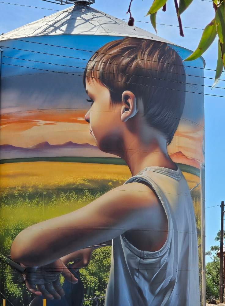 Rupanyup’s silo art is the work of Russian mural artist Julia Volchkova, who turned her attention to the town’s youth and great love of team sport. The work vividly captures the spirit of community and provides an accurate insight into rural youth culture.