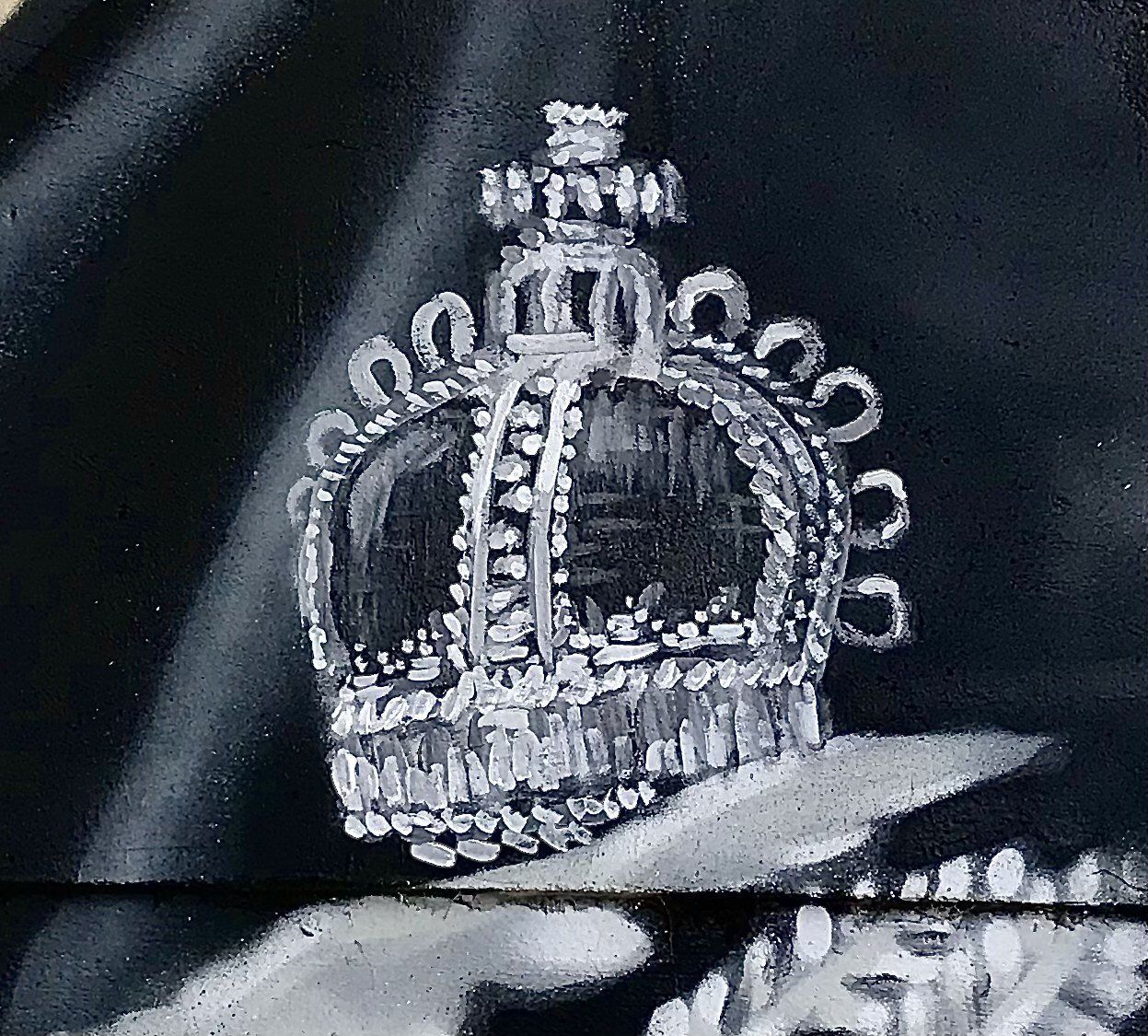 Nearing the centre of the mural, we have a reference to the young men that were enlisted sometimes as young as 16 years old being trained by much older and more experienced pilots. Sam wanted to capture the vulnerability and stark contrast between the youth of the boy and the magnitude of his situation.