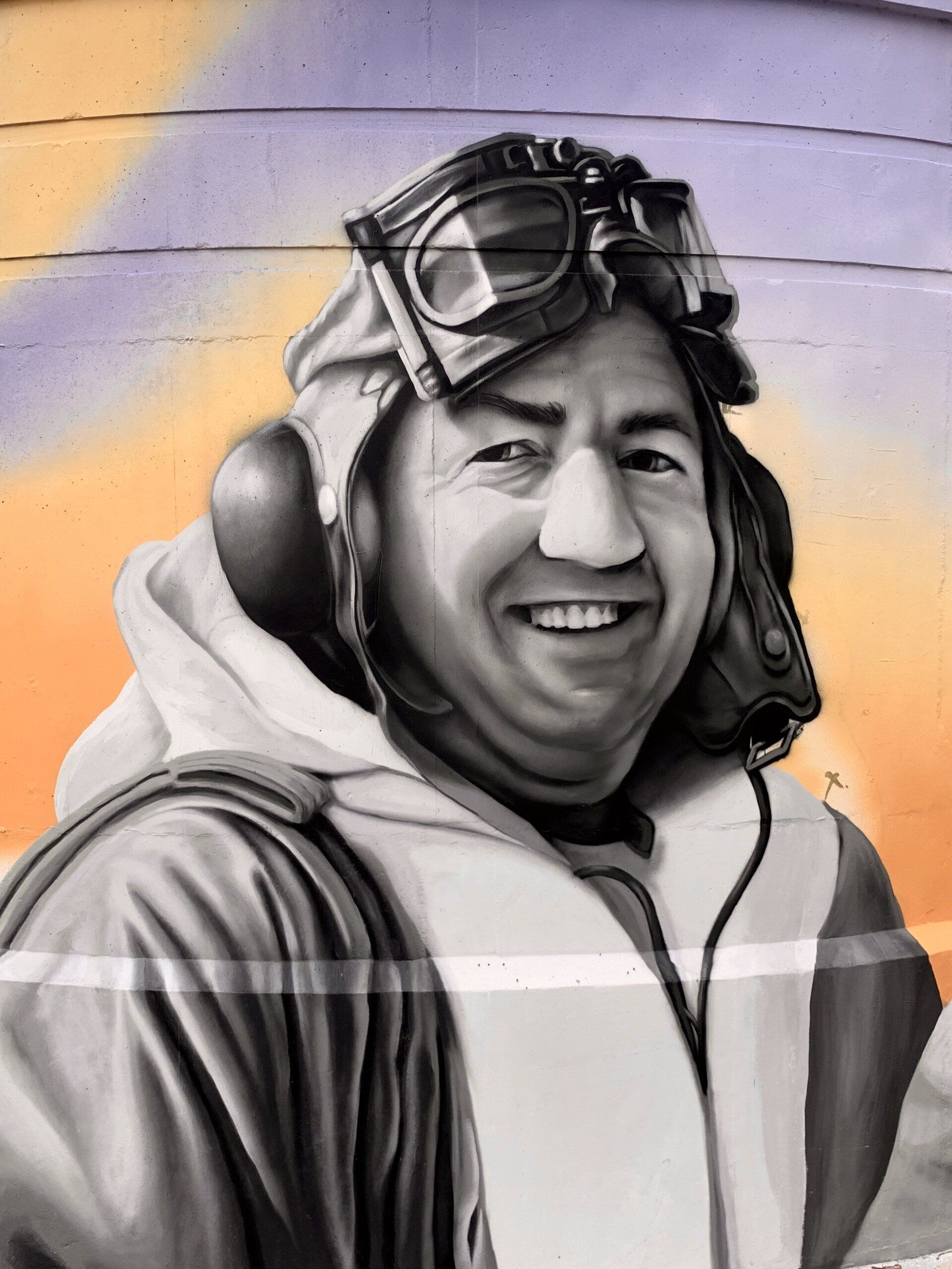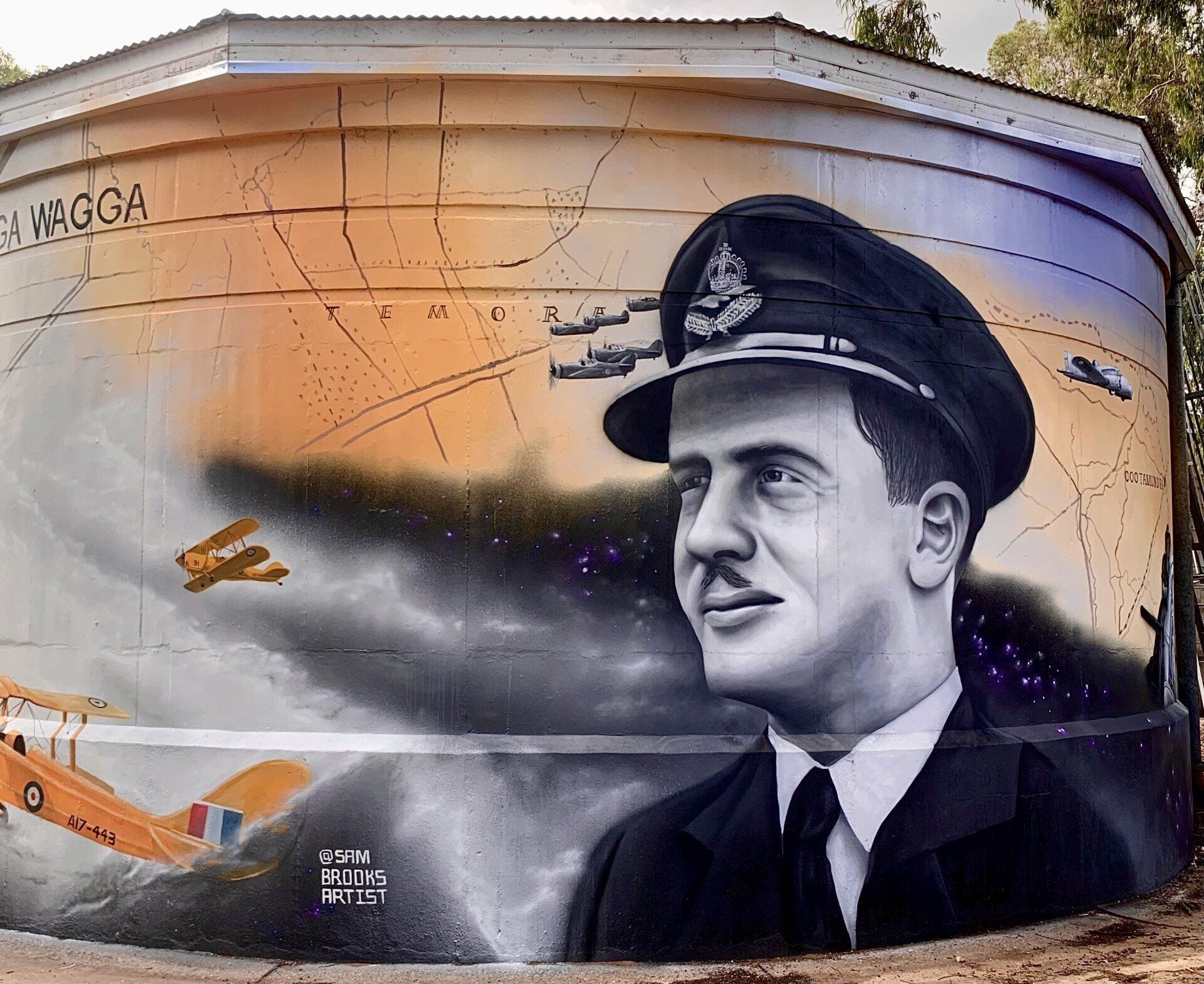 Throughout the mural there are many direct historical references to this piece of history. On the left, The famed pilot and instructor Norman Parry, is painted in front of his hometown map, which links to other major contributing towns of residents such as Narrandera, Uranquinty, Wagga Wagga, Temora and Deniliquin.
